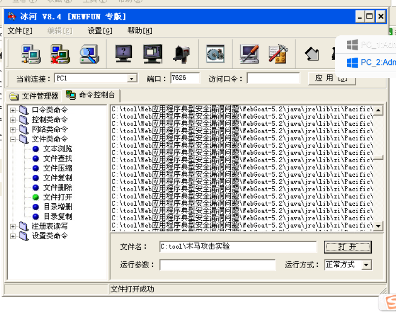 该类命令中,“文件浏览”、“文件查找”、“文件压缩”、“文件删除”、“文件打开”等菜单可以查看、查找、压缩、删除、打开远程主机上某个文件。“目录增删”、“目录复制”、可以增加、删除、复制远程主机上的某个目录。