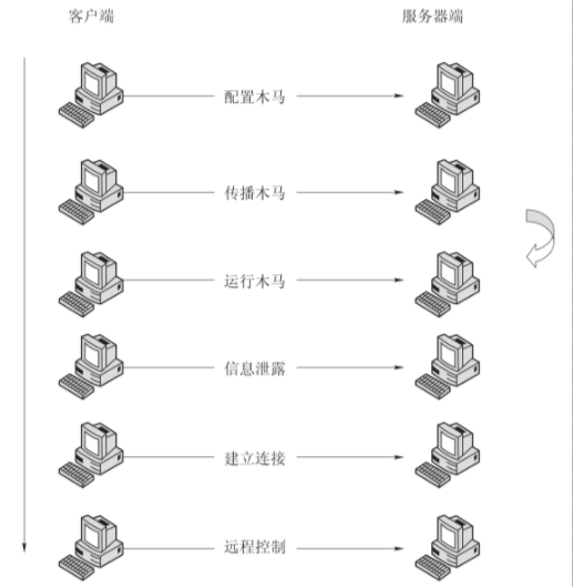配置木马----> 传播木马----> 运行木马----> 信息泄露----> 建立联系----> 远程控制