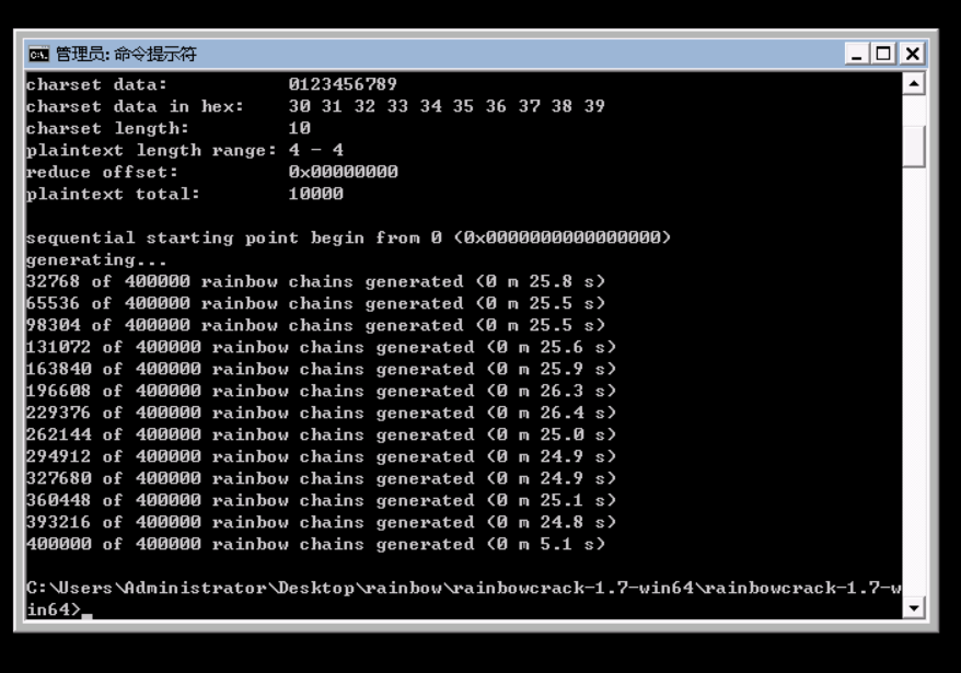 2.以攻击者的视角,通过生成相应的彩虹表来对4位数字密码MD5密文进行破解。