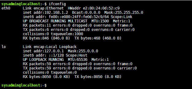The output shows two main blocks of information. The first block, indented by eth0, reflects information about your first Ethernet network card. The second block, indented by lo, reflects information about the "loopback" or internal network interface.