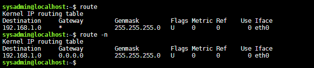 Notice that the output of the first route command, names were provided for some items (like *). In the output of the second route command, numbers were provided in place of names, the result of using the -n option to the routecommand.