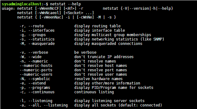 The netstat command performs a large variety of tasks related to networking. To get an idea of some of its capabilities, execute the command with the --helpoption: