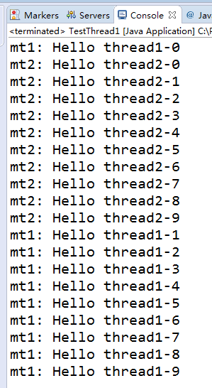public class TestThread1 { public static void main(String[] args) { MyThread mt1=new MyThread(); MyThread1 mt2=new MyThread1(); //setName方法为线程命名 mt1.setName("mt1"); mt2.setName("mt2");; //start方法开启线程 mt1.start(); mt2.start(); } } class MyThreadextends Thread{ @Override public void run() { for (int i =0; i < 10; i++) { //currentThread()为Thread类的静态方法,作用是得到当前正在运行的线程 System.out.println(Thread.currentThread().getName() +": Hello thread1-" + i); } } } class MyThread1extends Thread{ @Override public void run() { //调用yield方法使当前线程暂停等其它线程执行完毕之后再执行它 //Thread.yield(); for (int i =0; i < 10; i++) { //currentThread()为Thread类的静态方法,作用是得到当前正在运行的线程 System.out.println(Thread.currentThread().getName() +": Hello thread2-" + i); } } } |