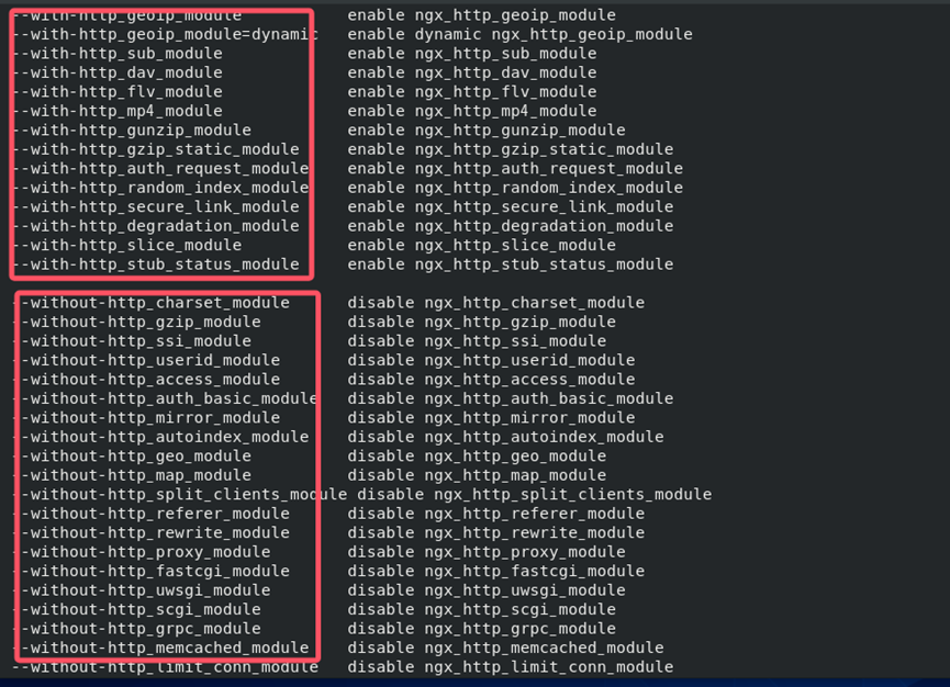 其中的prefix是安装路径,而--with-xxx_xxx参数,代表默认没有开启的模块,如果需要开启要把参数加在./configure里面,--without-xxx代表的就是默认已经开启的模块,如果不需要该模块也可以在./configure里面加参数
