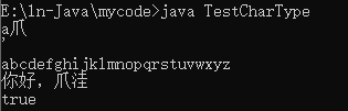 public class TestCharType{ public static void main(String[] args) { char c1 = 'a'; char c2 = '爪';//unicode 2:0-65535 char c3 = '\'';//转义 System.out.print(c1); System.out.println(c2); System.out.println(c3); char c4 = 'a'; for(int i=0;i<26;i++) { char temp = (char)(c4+i); System.out.print(temp); } System.out.print('\n'); String str = "你好,爪洼"; System.out.println(str); boolean b = true; if(b){ System.out.println("true"); } } }