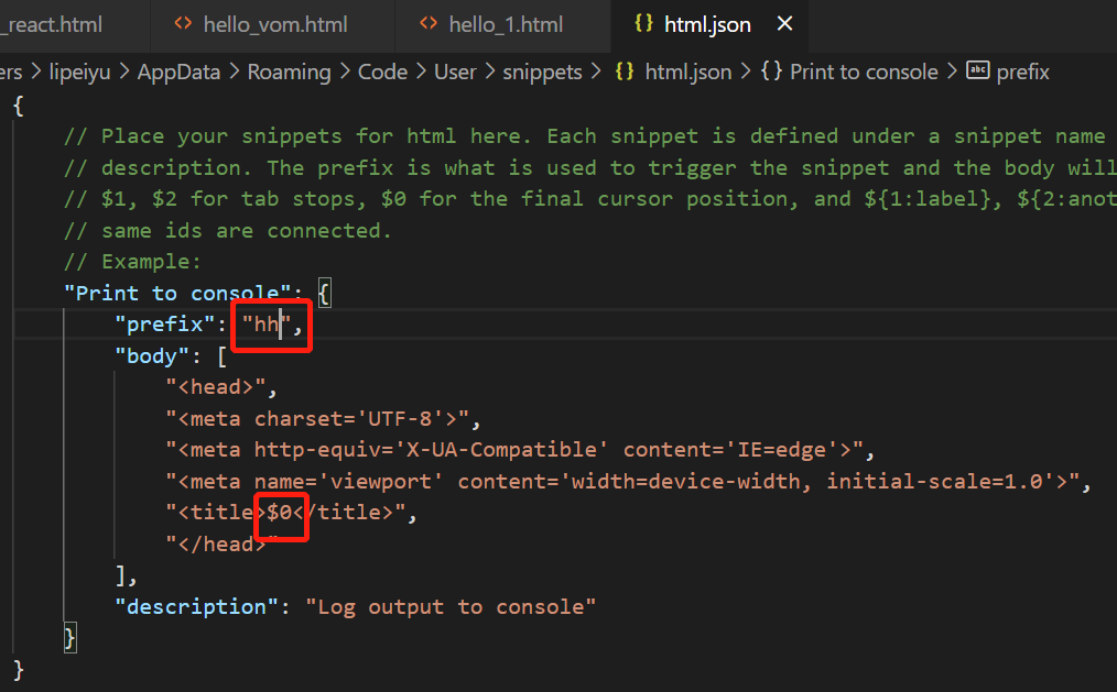 其中hh表示代码片段的简写,在编辑器中输入hh,直接出来boby中的内容,$0将鼠标定位到此处