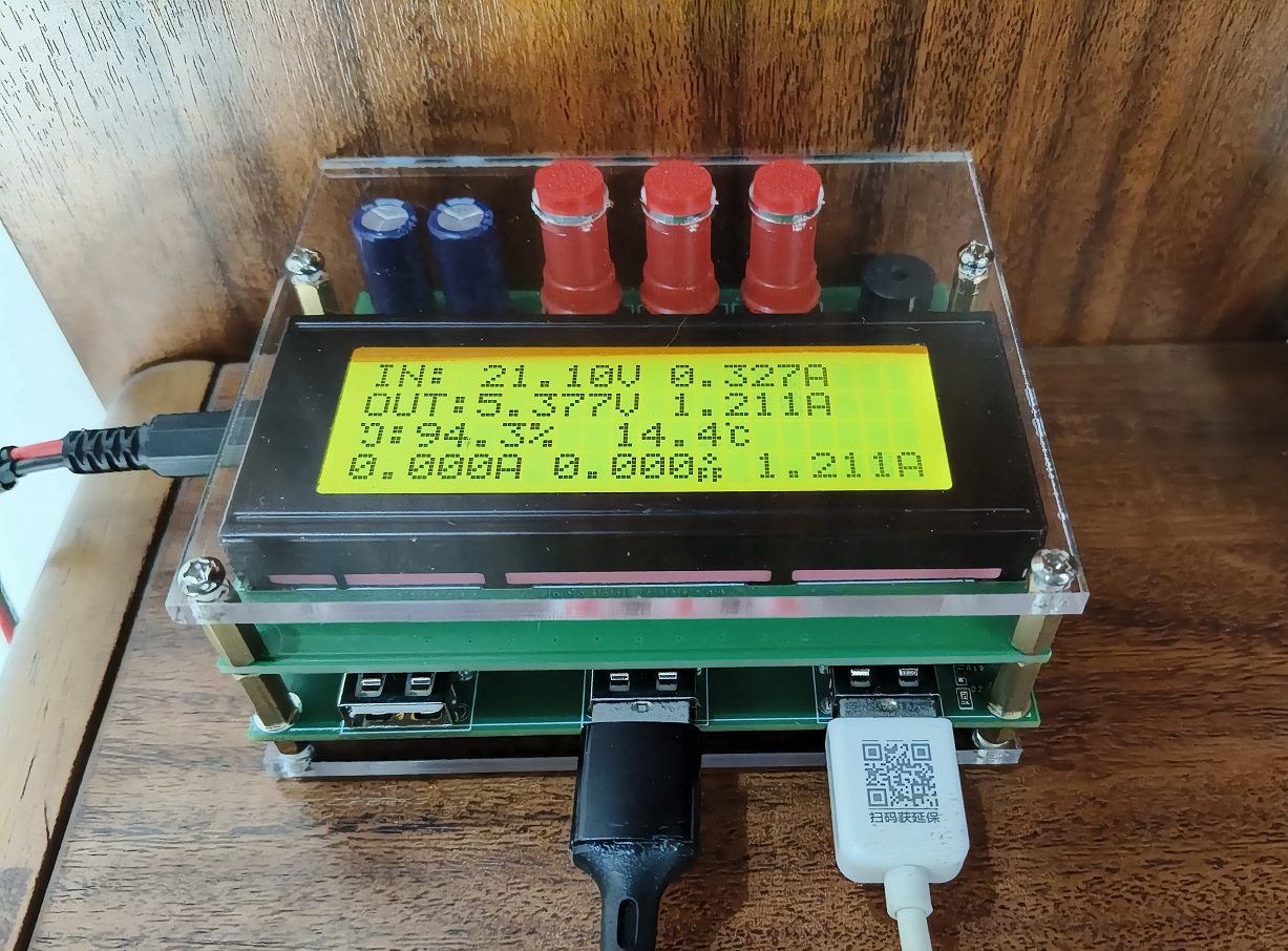设计基于Arduino Nano,拆了一个Arduino Nano的ATmega328P-AU芯片和陶瓷谐振器,软件使用Arduino IDE开发。使用了ATmega328P的Power-down模式(小于0.4mA)以降低平均功耗,2004液晶屏的背光电流也限制到5mA左右。目前有输入、输出的电压、电流监测、温度检测、过流保护与告警等功能,每个输出通道可以独立关断。下图飞线为热敏电阻,直接监测DC-DC芯片表面温度。