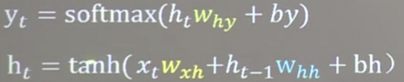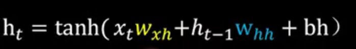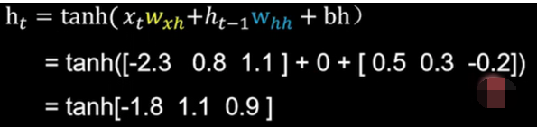 等于 tanh(当前时刻输入特征Xt 乘以 矩阵 Wxh 加 上一时刻记忆体存储状态Ht-1 乘以 矩阵 Whh 加上 偏置项Bh)