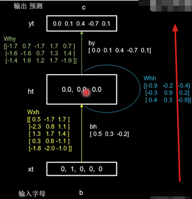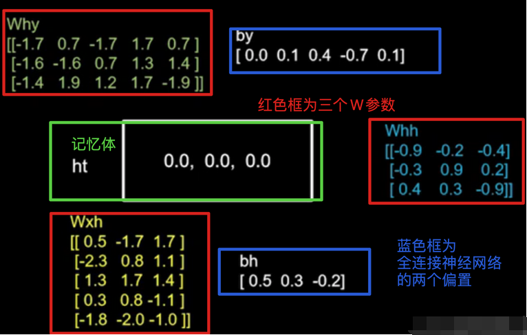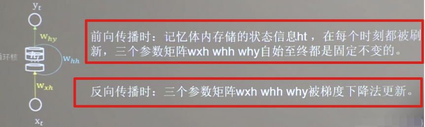 前向传播是 更新 记忆体的状态(记忆体内存储的状态信息 ht 在每个时刻都被刷新),而三个参数矩阵 wxh、whh、why 和两个偏置项 bh 和 by 自始至终都是固定不变的。