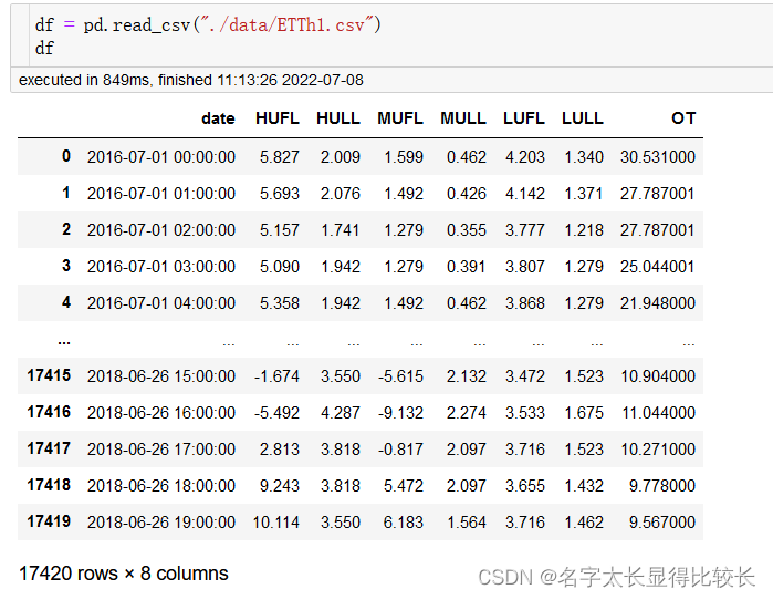 每个数据点均包含8维特征,包括数据点记录日期,预测目标值oil temperature和6个不同类型功率负载特征。