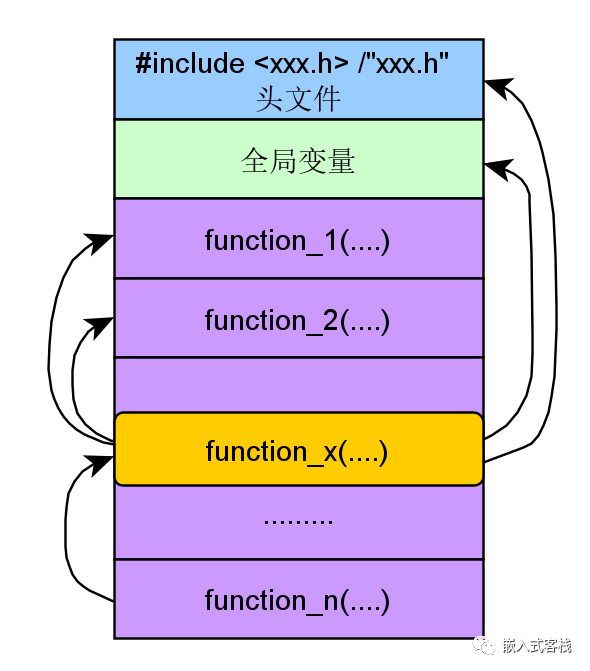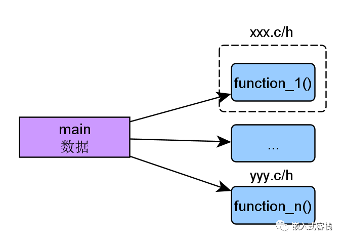 比较典型的–C, Pascal, Basic, Fortran语言,传统的做法是整了很多函数,整合时主要是整合各函数的调用,main函数协调对过程的调用,并将适当的数据作为参数在调用间进行传递流转而实现业务需求。信息流转主要靠: