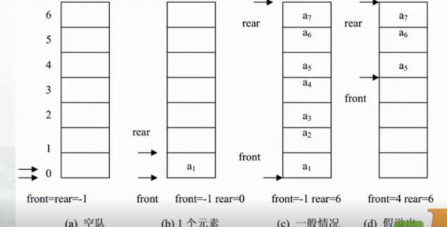 用数组创建一个普通队列,当有数据存储时,队列尾指针不断增加,直到空间用完,当数据出队列时,队列头指针不断增加,直至和队列尾相同时,所有数据完成出队列,那么这时候会引入一个问题,全部出队后,将无法继续入队,这样的情况也叫做“假溢出”,即使数组中,明明还有空间可以利用,但是却无法使用(平时我们做串口接收的时候,往往是通过清零计数器,清空数组,重新接收来解决这一问题)。