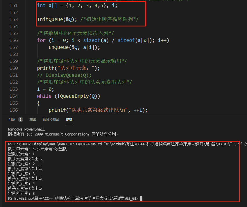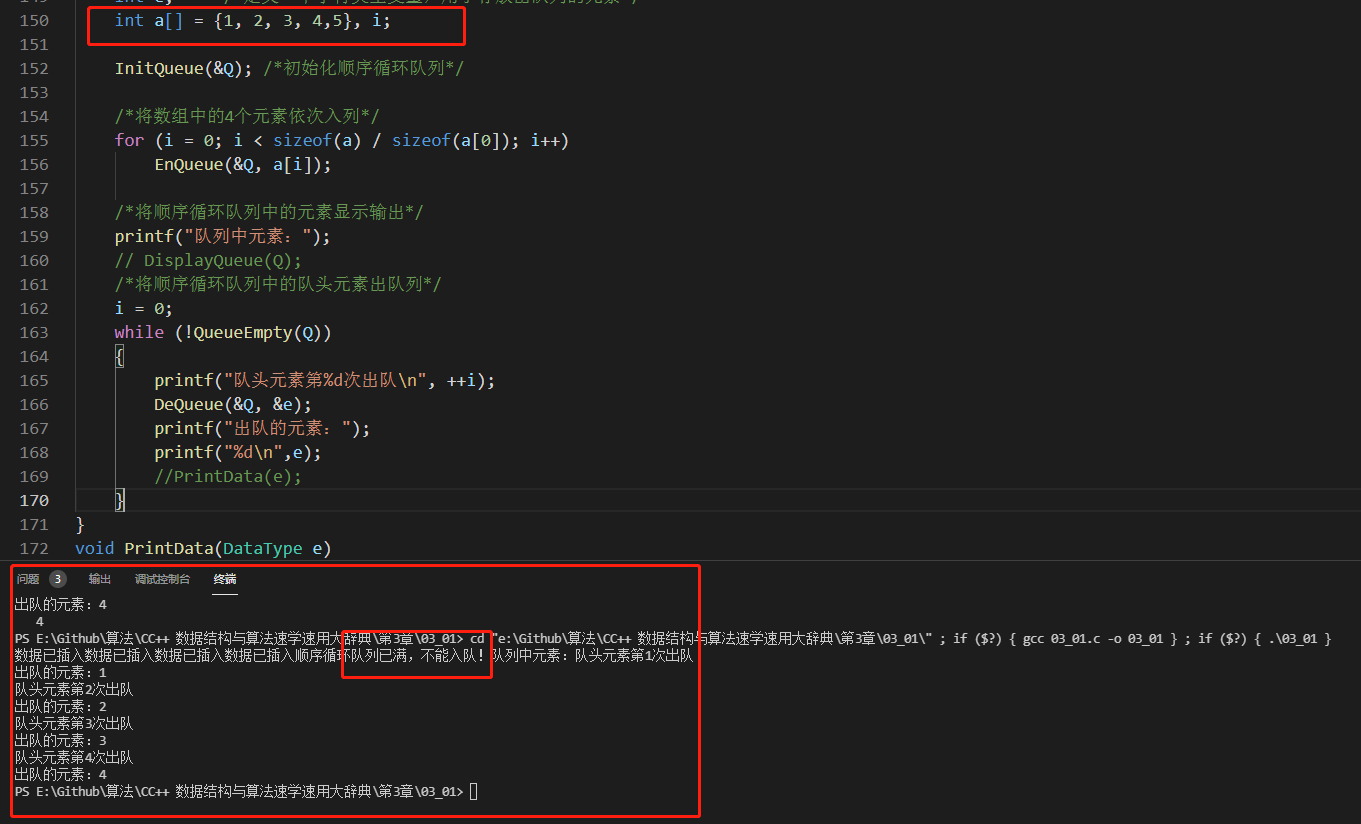 相比较上面的测试结果,小伙伴们有没有发现什么不同之处呢,我们main函数想把5个元素写入队列,实际上只写进去了4个,原因在与,我们预留了一个单元空间,用于判断队列空或者满的状态。