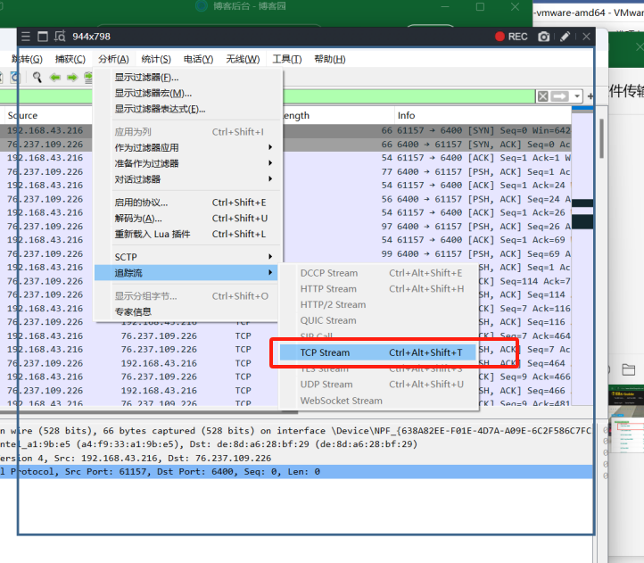 这里我是从BBSguide网站找的第一家最近发布的BBS服务器,名字叫做从13th Floor BBS,地址为13th.hoyvision.com,开放端口为6400,Wireshark 捕获的 TCP 握手数据包中可以看到目的 IP 地址和端口号。他的IP地址和端口号为76.237.109.226,端口号为6400,和网站上的是一样的。