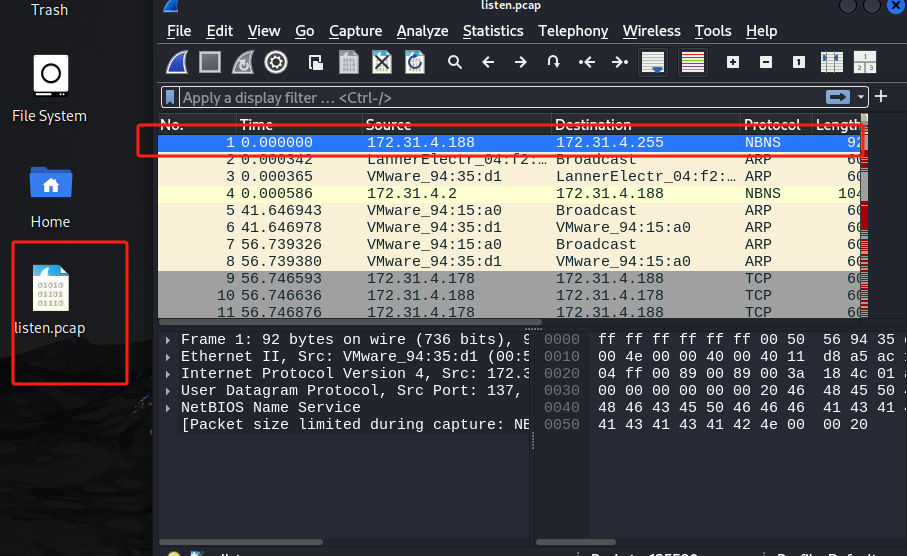 下载listen.pacp文件,由于下载了vmware tools因此直接拖动进入kali终端后在wireshark中打开如上,由此可以看到攻击主机应该是172.31.4.178向172.31.4.188发起了TCP连接,但具体发动的何种攻击仍然不知道