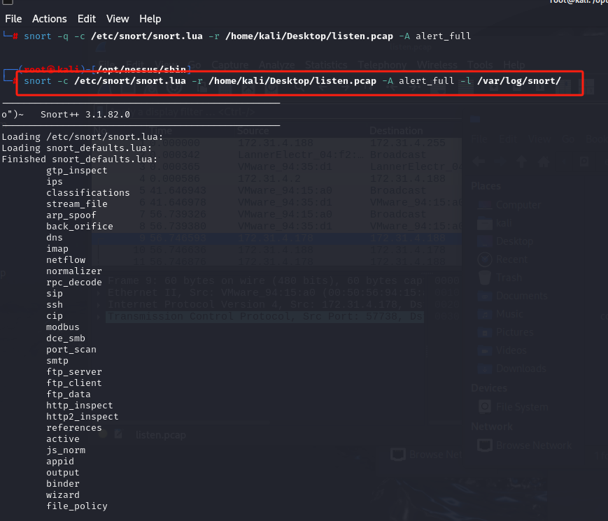使用了snort -c /etc/snort/snort.lua -r /home/kali/Desktop/listen.pcap -A alert_full -l /var/log/snort/命令来查看日志中有无发现是何种攻击,但是无法显示,只有大致的数据包统计和各类型命令总的情况,于是在/etc/snort/snort.lua 文件中加入enable_builtin_rules = true后得以显示,显示的攻击类型如下