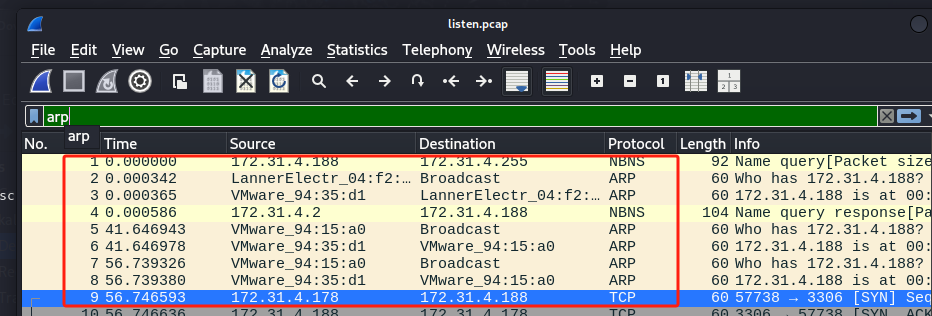 在wireshark中查看数据,根据Nmap攻击的基本流程,会先查看目标主机是否活跃,对应上述1-9的Arp包