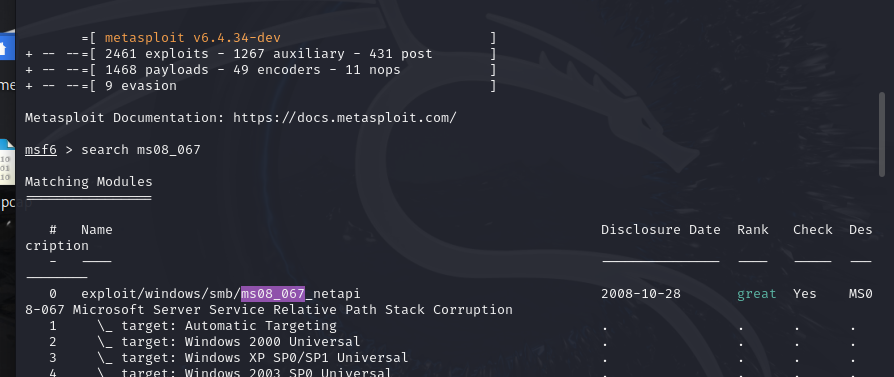随后输入search ms08 067指令查看漏洞的具体信息,windows 2K存在此漏洞,在攻击范围之内