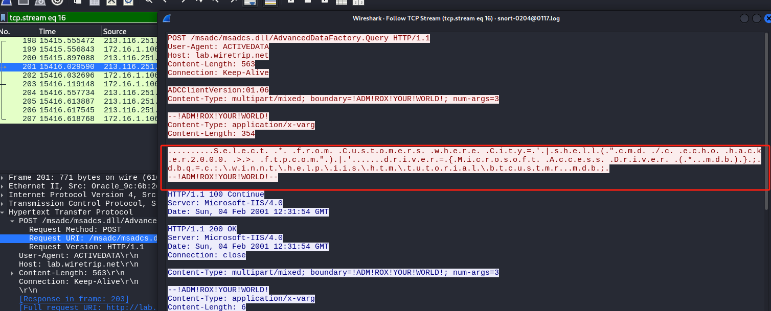 shell语句(执行了命令cmd /c echo werd >> c : fun)和频繁出现的"!ADM!ROX!YOUR!WORLD!"字符串,这个字符串和SQL注入语句语句相结合,得到实际SQL命令为SELECT * FROM Customers