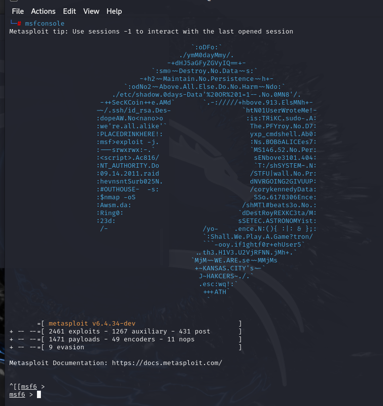 ①启动Metasploit软件,可根据个人喜好使用msfconsole、msfgui、msfweb之一;