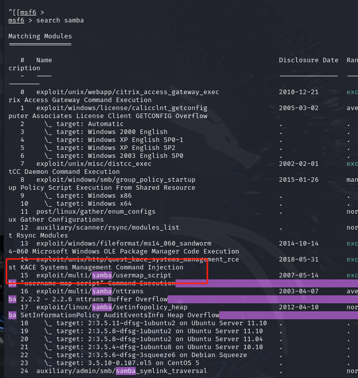 输入search samba,这里发现第十五个模块即为漏洞对应的模块