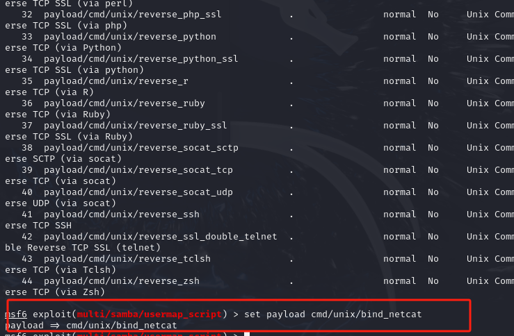 输入set payload cmd/unix/bind_netcat设置攻击载荷为bind_netcat