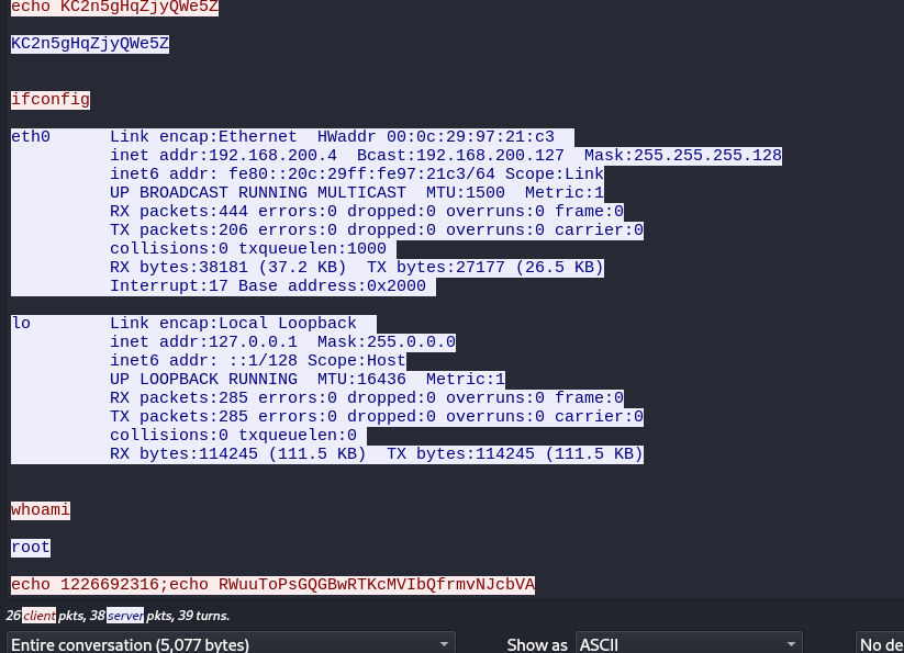 对抓包结果进行分析,攻击过程如下,攻击机ip为192.168.200.6,靶机ip为192.168.200.4,攻击机端口为139,靶机端口为32791,随后公积金端口38065与靶机之间的4444,建立起持久连接用以传输指令和回显显示