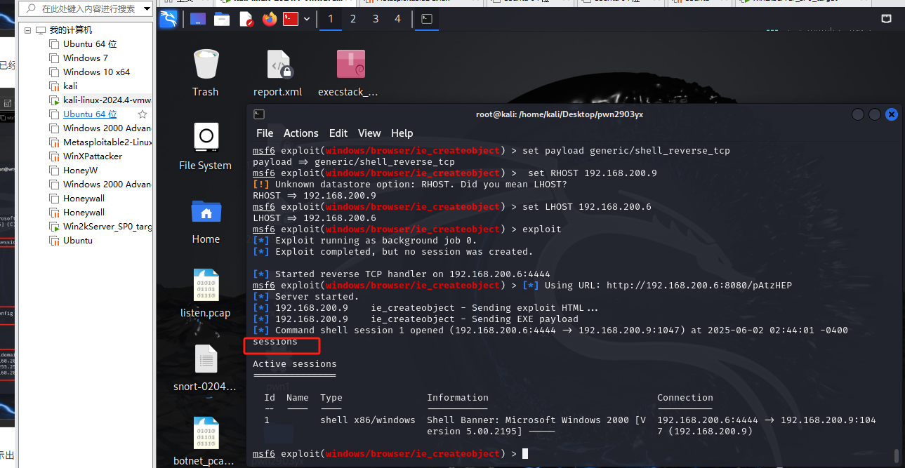 随后使用攻击机kali,输入sessions查看当前的连接,攻击机kali与靶机win2k已经成功建立终端连接