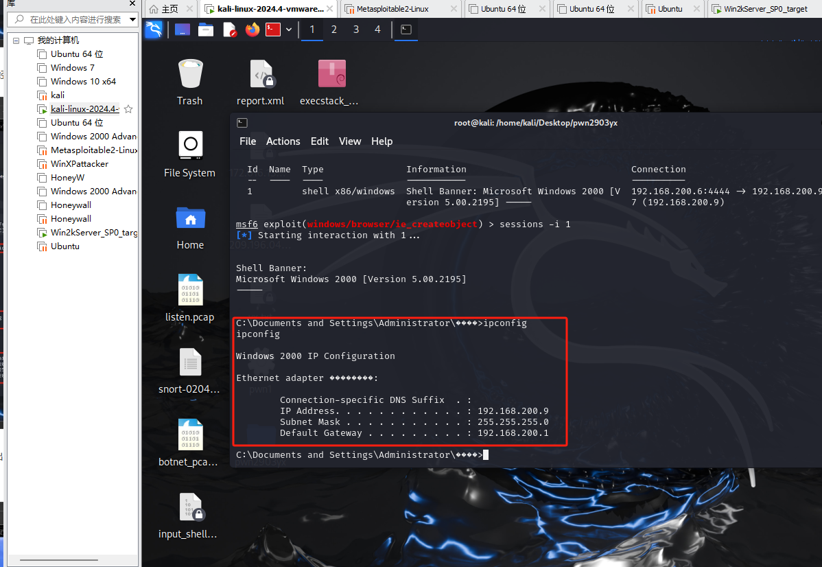 打开win2k会话,输入ipconfig显示出了靶机win2k的ip信息,攻击成功