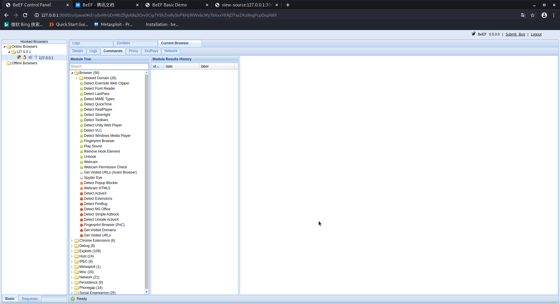 在内部,BeEF可以检;测出哪些命令模块可以在当前受害的浏览器工作, 并用颜色表示:
