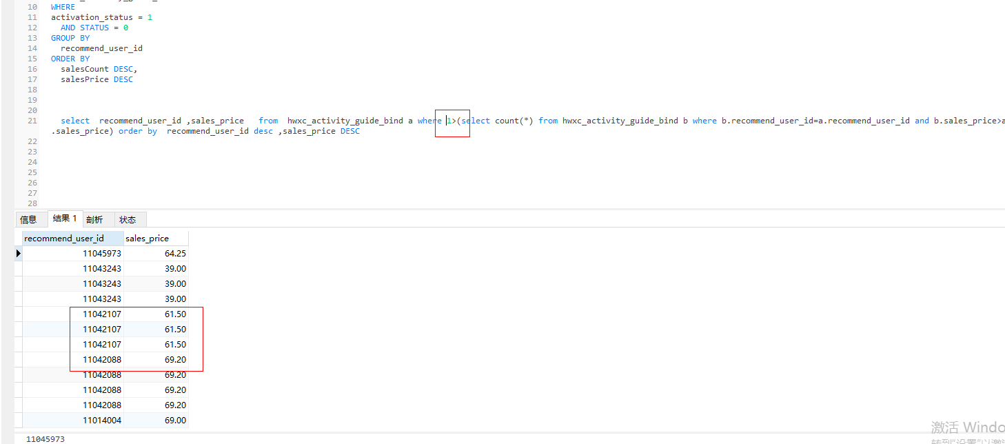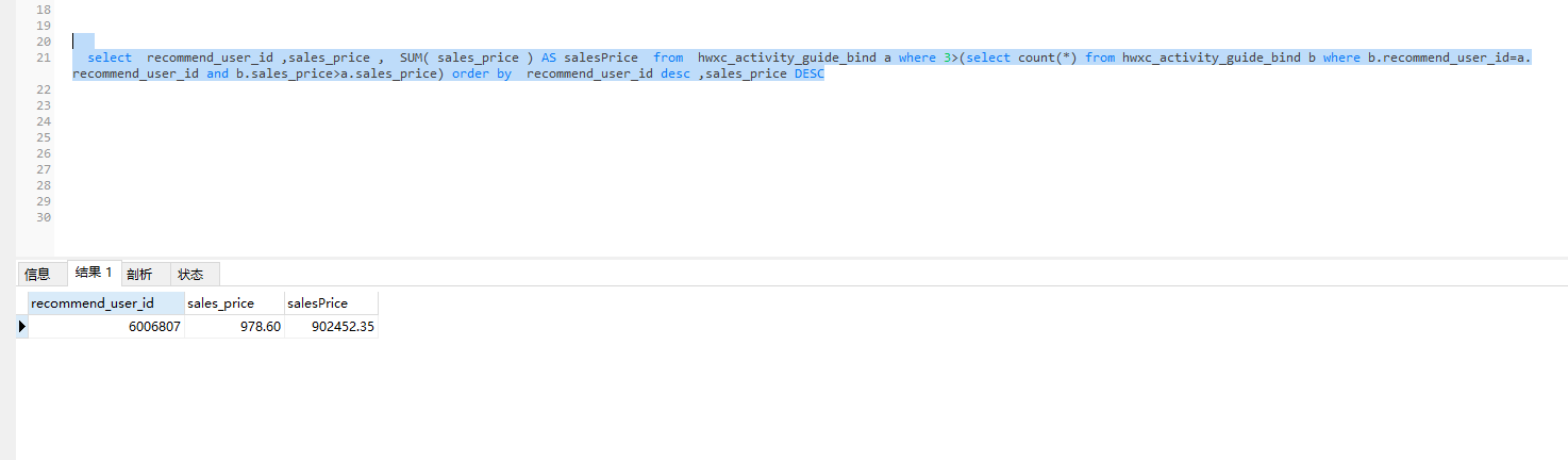 select recommend_user_id ,sales_price , SUM( sales_price ) AS salesPrice from hwxc_activity_guide_bind a where 3>(select count(*) from hwxc_activity_guide_bind b where b.recommend_user_id=a.recommend_user_id and b.sales_price>a.sales_price) order by recommend_user_id desc ,sales_price DESC 结果如下: