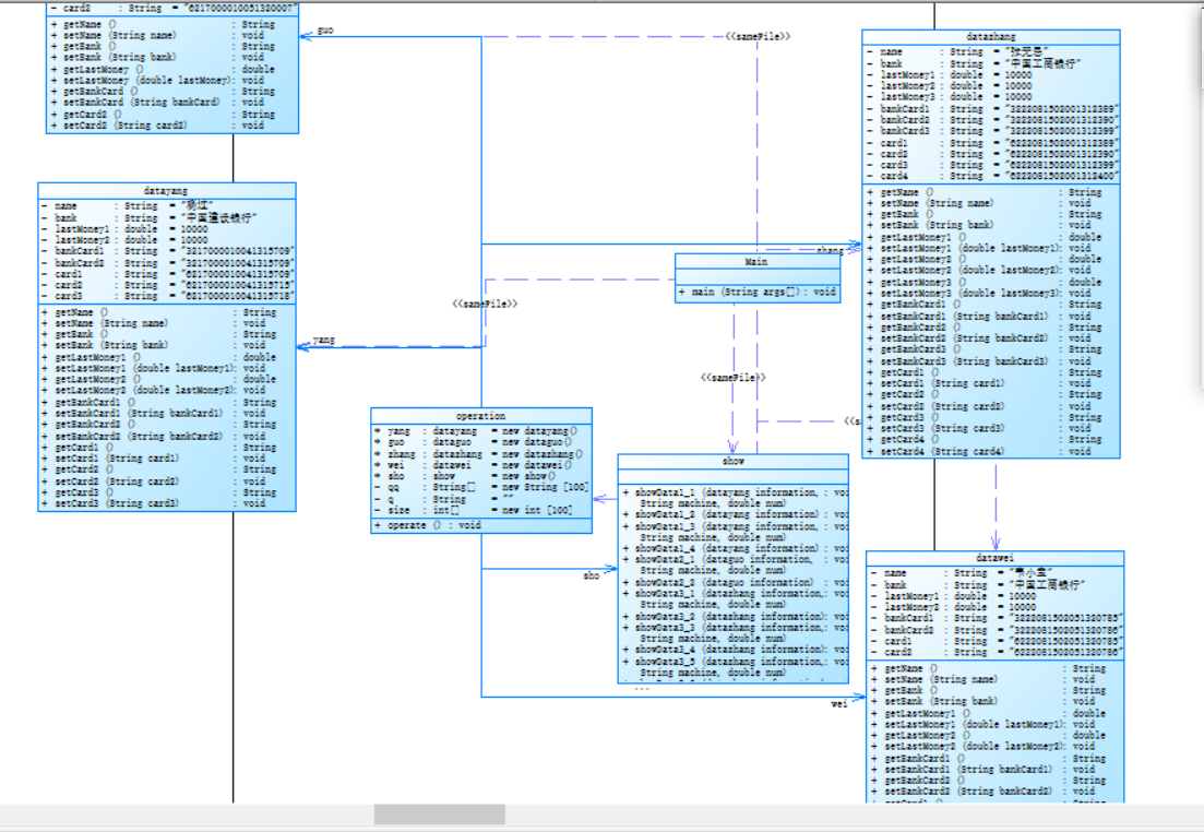设计思路:首先按照题目要求,构造出想要的类,对于每一个类,之间的方法,需要进行构思,对于一开始就没有设计好的好,产生了很多的重复代码,以至于代码长度会特别长,代码质量是不良的,所以我推 荐大家仅仅攻参考,这是像我这样学过c语言的人,比较难以摆脱的内容,需要慢慢向面向对象的方向进行走一走,设计时候,可以对于每个人的账号为一个类,采用继承的方式,每个人能的卡都继 承于同一个类,能够节省很多的重复的代码,实现代码的复用会好很多,而不是采用以每一个人来做一个类,我采用人的设计,导致后来产生了很多的问题