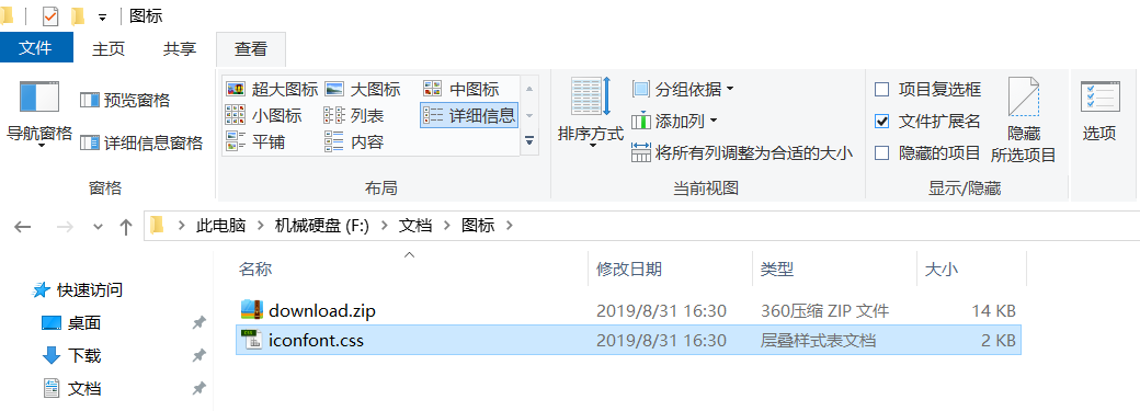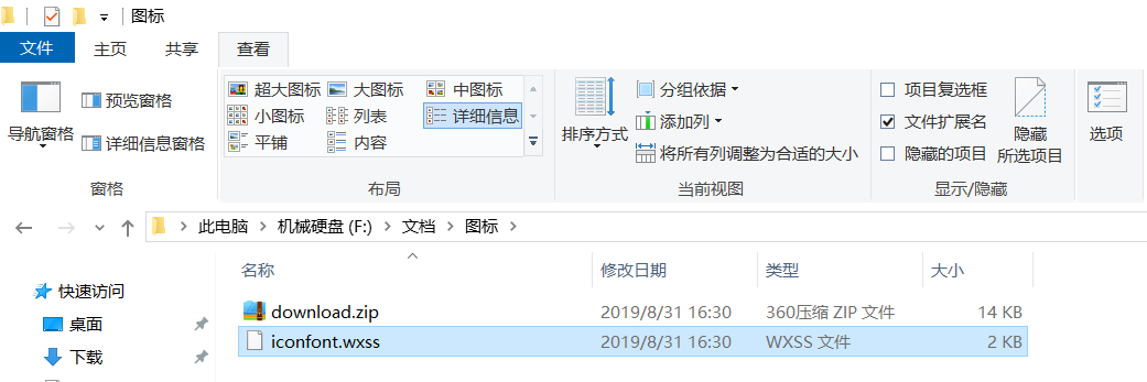 选择iconfont.css文件,点击计算机的“查看”,勾选“文件扩展名”,将.css改为.wxss