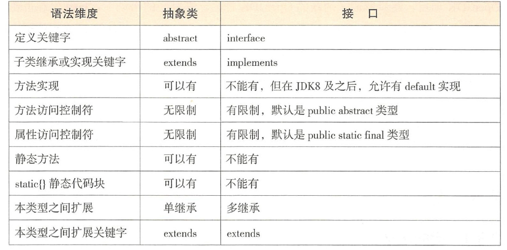 - 抽象类在被继承时体现的是is-a关系,接口在被实现时体现的是can-do关系。与接口相比,抽象类通常是对同类食物相对具体的抽象,通常包含抽象方法、实体方法、属性变量