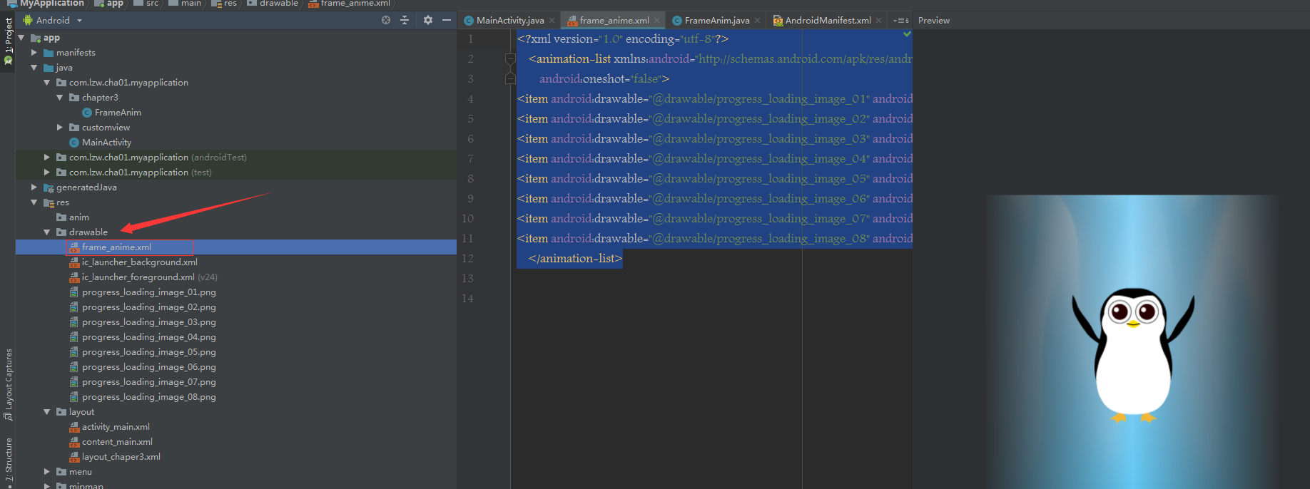 - 补:AndroidStudio中帧动画相关的xml文件放在drawable文件夹中而不是anim文件夹中。