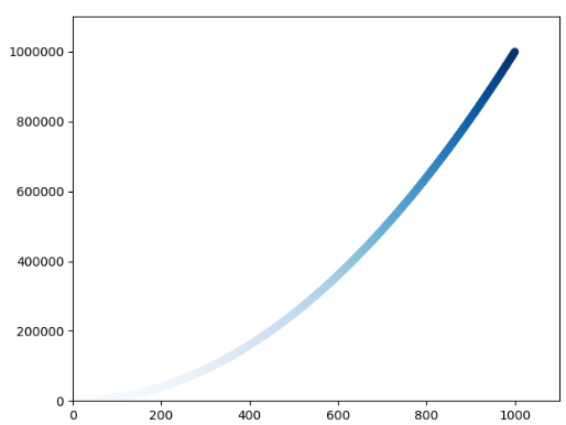 import matplotlib.pyplot as plt x_values = list(range(1, 1001)) y_values = [x**2 for x in x_values] # x**2表示求平方 plt.scatter(x_values, y_values, c=y_values, cmap=plt.cm.Blues, edgecolors='none', s=40) # 要删除数据点的轮廓可传实参edgecolors='none' plt.axis([0, 1100, 0, 1100000]) # 设置x和Y坐标的最小值和最大值 # plt.show() #一定要把这行注释,否则保存下来的图标就是一张白色的图片什么内容都没有 plt.savefig('square_plot.png', bbox_inches='tight')