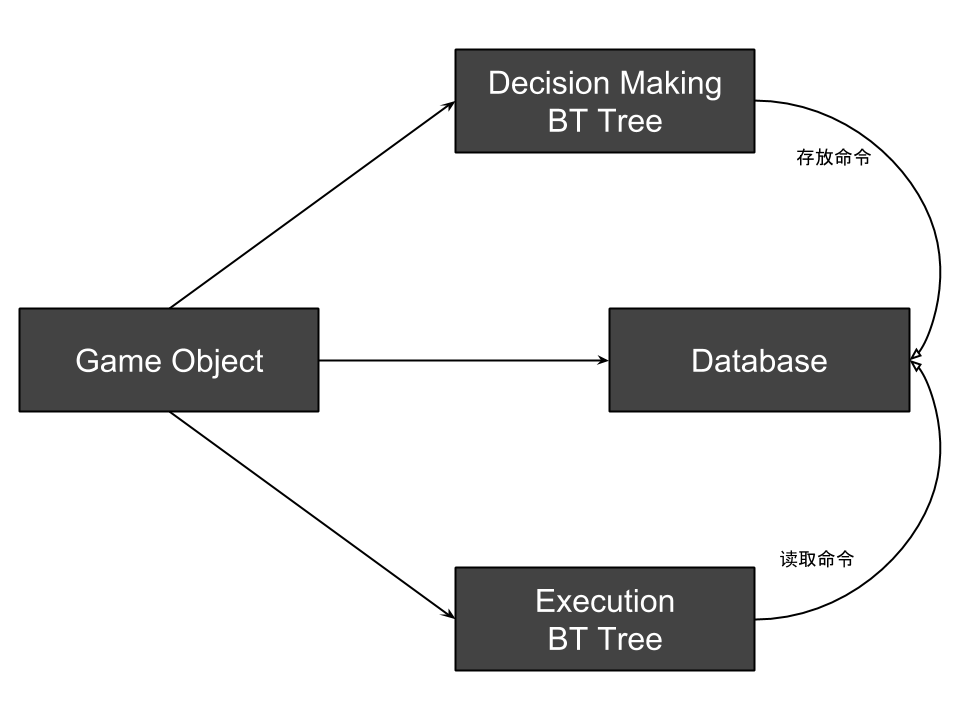 有一个做决策的行为树A,和一个按照命令执行的行为树B。A根据游戏世界的情况做出决策,然后将命令放到Database里,然后B根据命令做出动作。由于两个行为树都放在一个Game Object里,所以Database是A、B共享的。通常,决策者A并不会每一帧都做出决策,而是设定一个冷却时间。