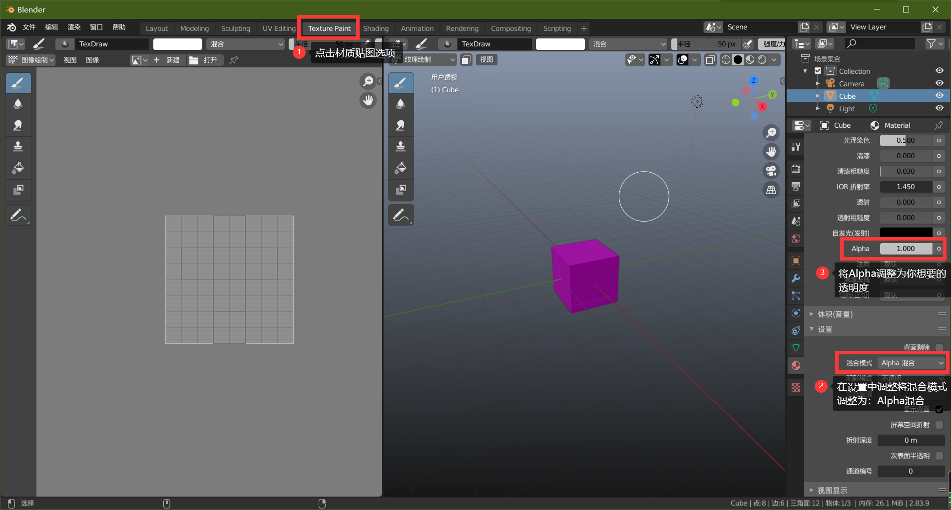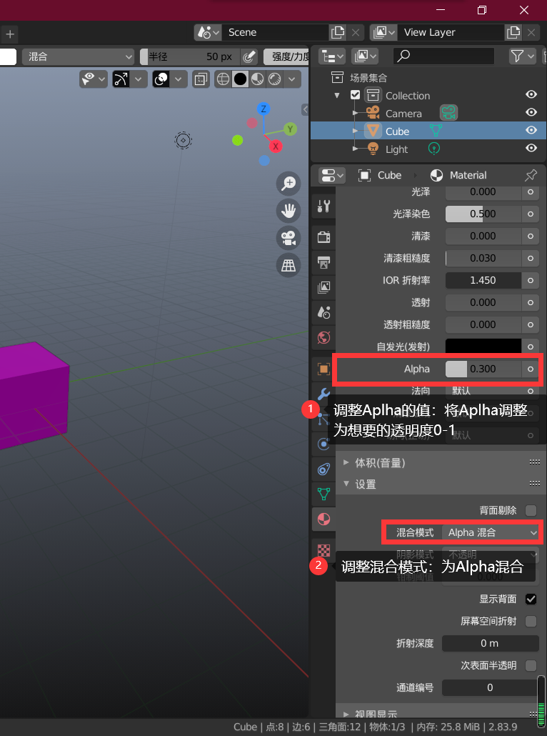2、点击材质属性,在设置内将混合模式设置为Alpha混合,