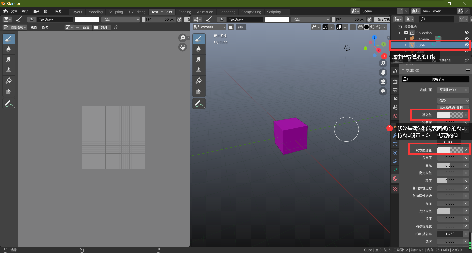 3、将表(曲)面下的基础色、次表面颜色、设置为全透明颜色 Alpha设置为想要的比例。