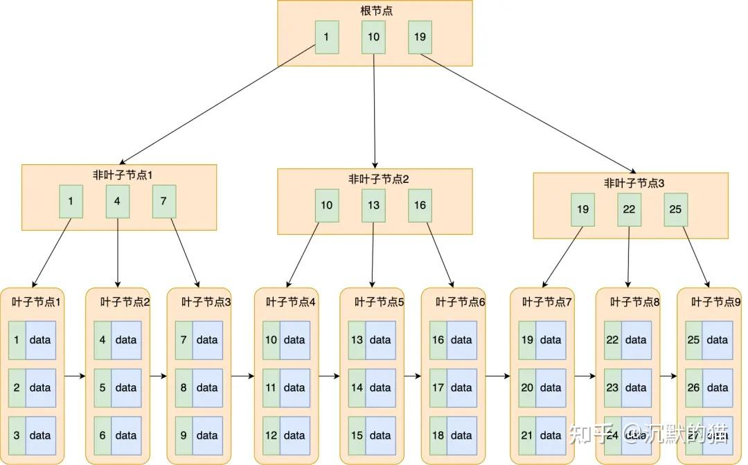- 由于B+tree父节点所有元素都会存在子节点中,所以B+tree所有的索引都会出现在叶子节点中,且叶子节点会构成一个有序链表