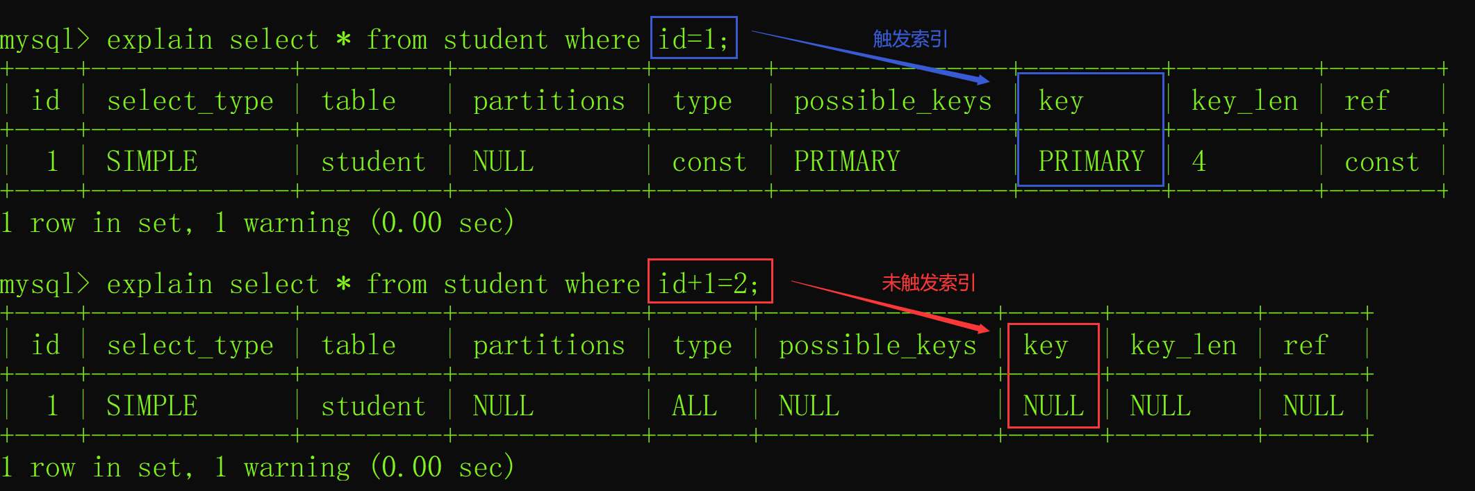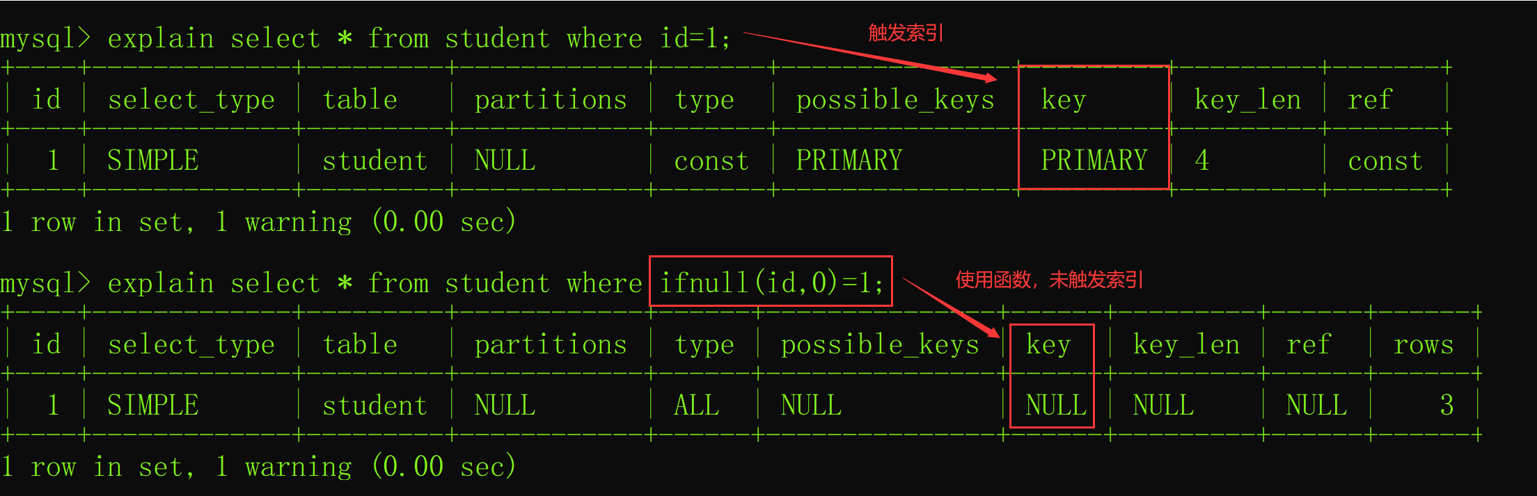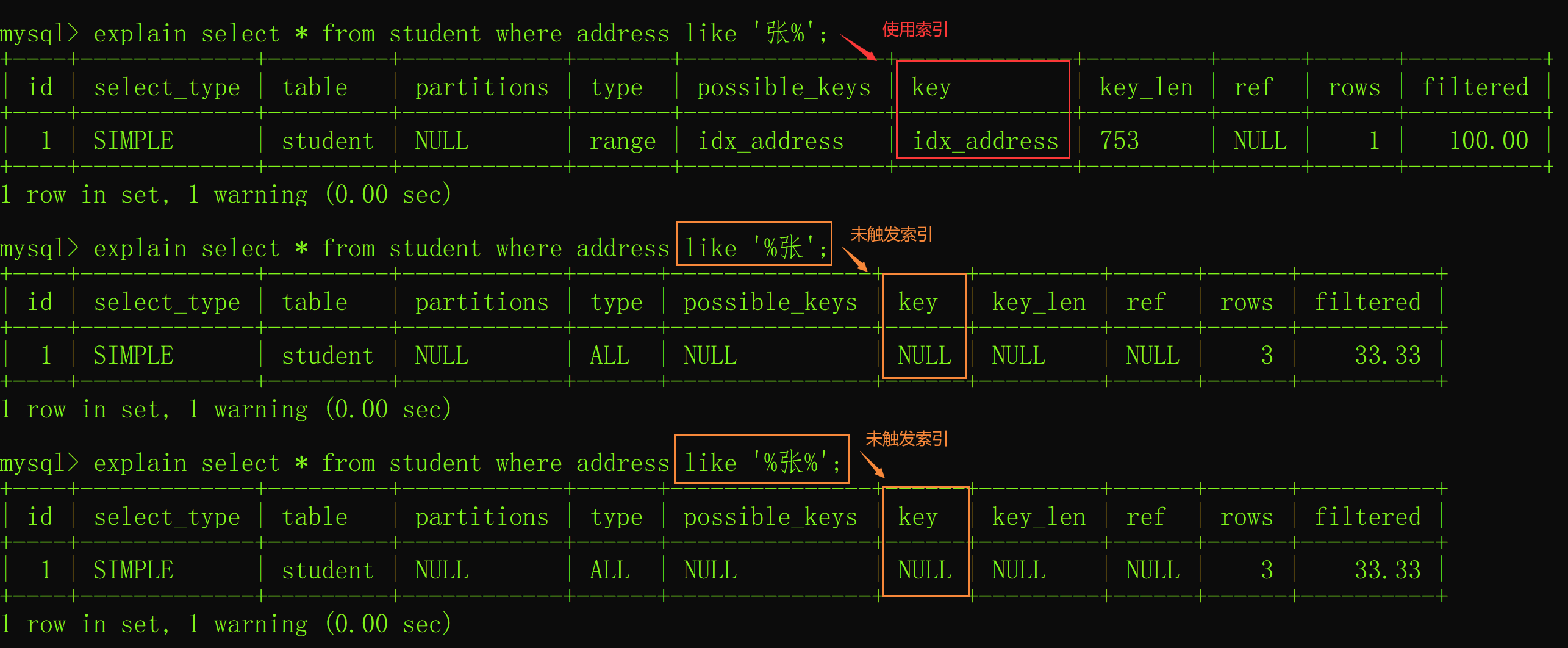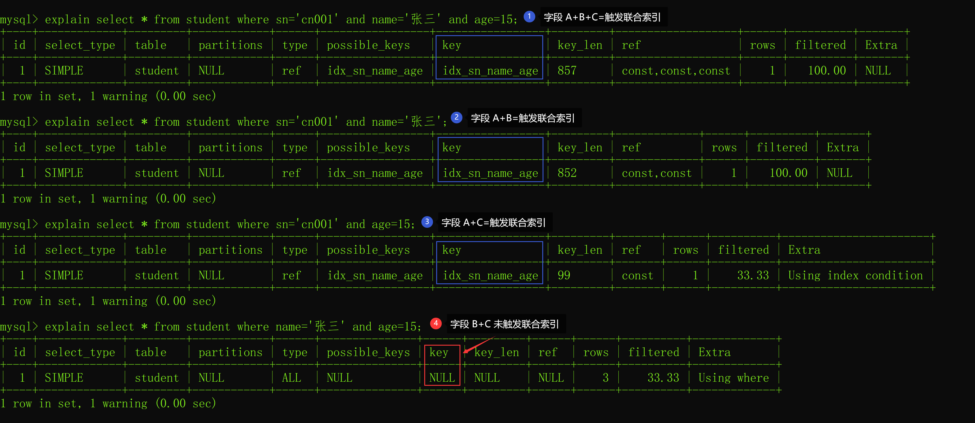 如下图中,在student表中创建了sn + name + age的联合索引,不同的where条件会引起联合索引是否生效