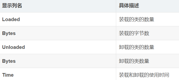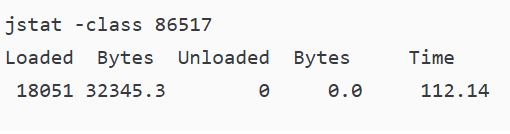 -class:显示classLoader相关信息,类加载、卸载数量、类装载所消耗时间等