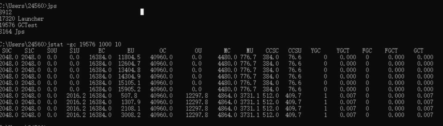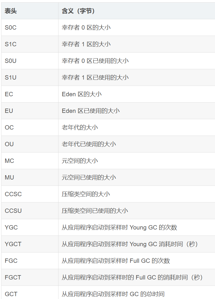 - jstat:JVM static monitorTool,用于监控指定进程的jvm统计信息,是运行期定位虚拟机性能问题首先工具