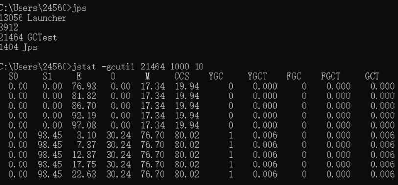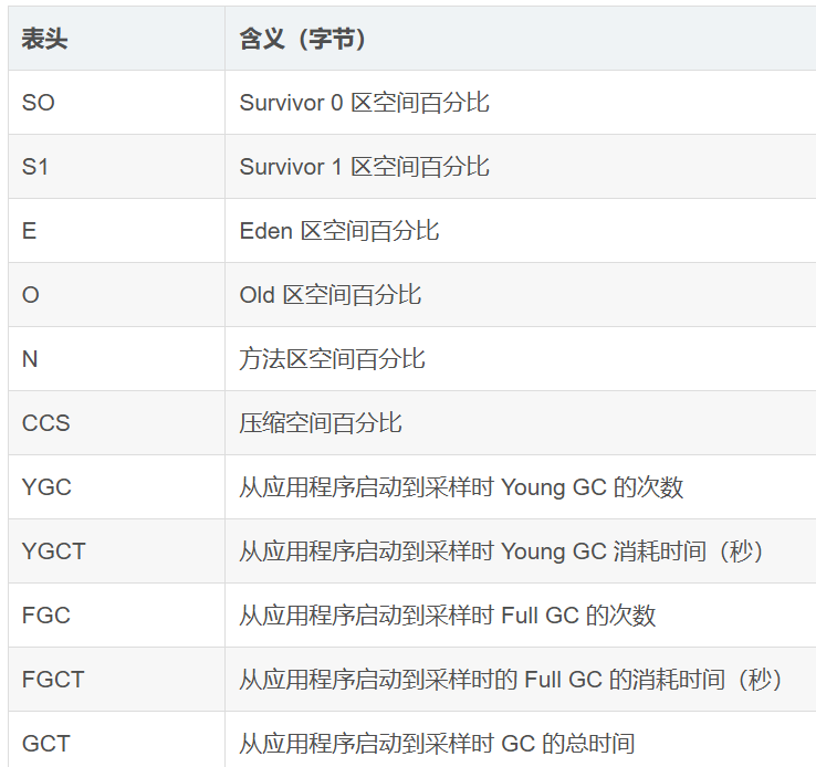 -gcutil:与-gc类似,更关注于java堆中已使用空间与总空间比值