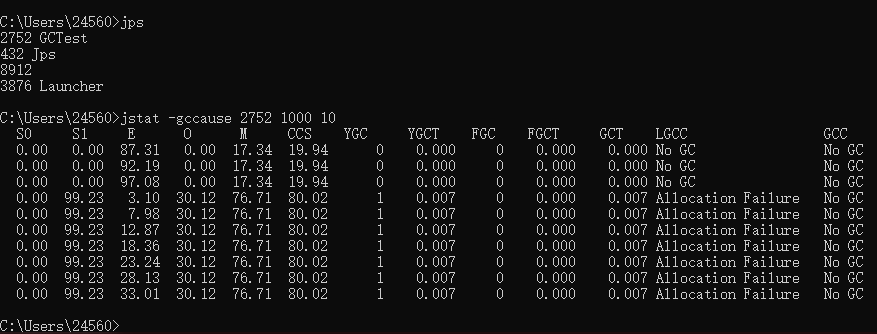 -gccause: 与gc类似,最后新增一列最后一次或当前正在发生的 GC 产生原因