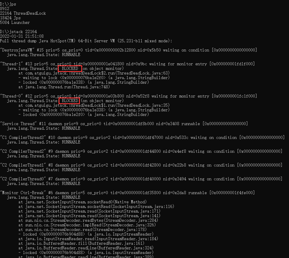 - jstack:JVM Stack Trace,打印指定进程的此刻线程快照,用于查看线程死锁、阻塞等问题