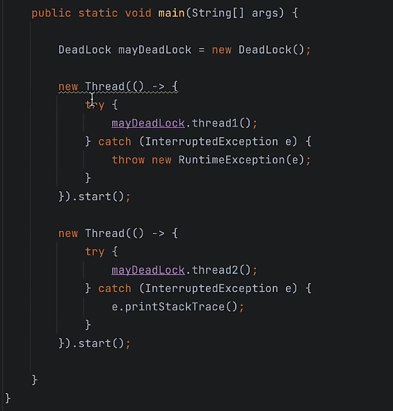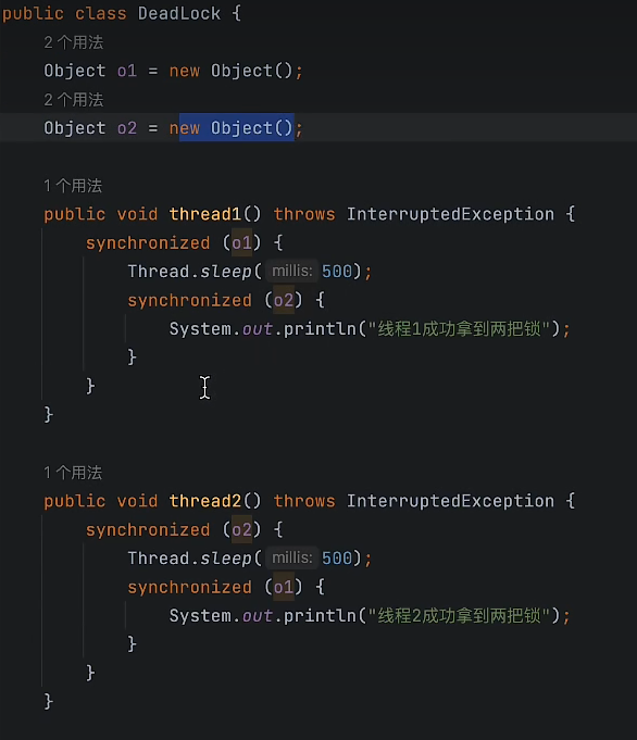 - 死锁:两个线程在持有锁的前提下,尝试获取对方锁,从而一直阻塞的情况